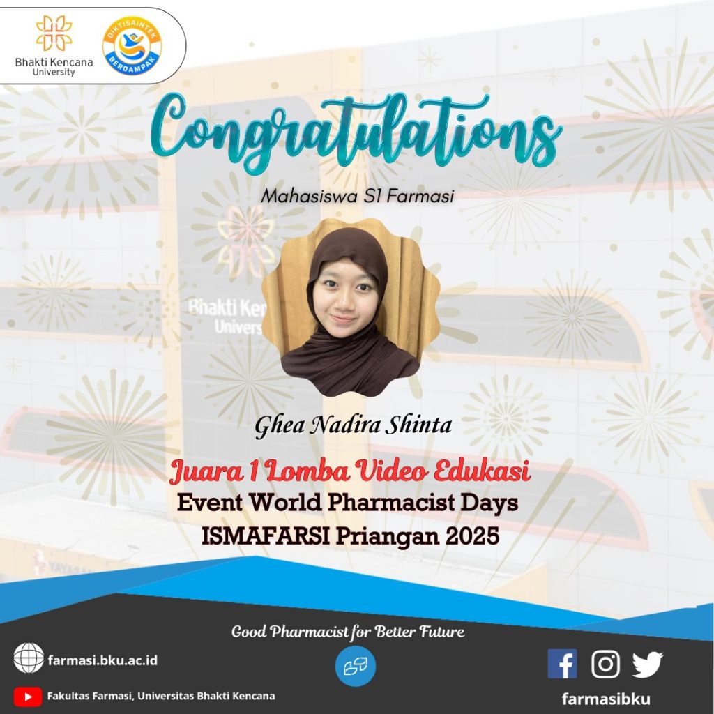 Fakultas Farmasi Bhakti Kencana University kembali menorehkan prestasi membanggakan melalui salah satu mahasiswanya, Ghea Nadira Shinta, yang berhasil meraih Juara 1 Lomba Video Edukasi pada rangkaian Event World Pharmacist Days ISMAFARSI Priangan 2025.